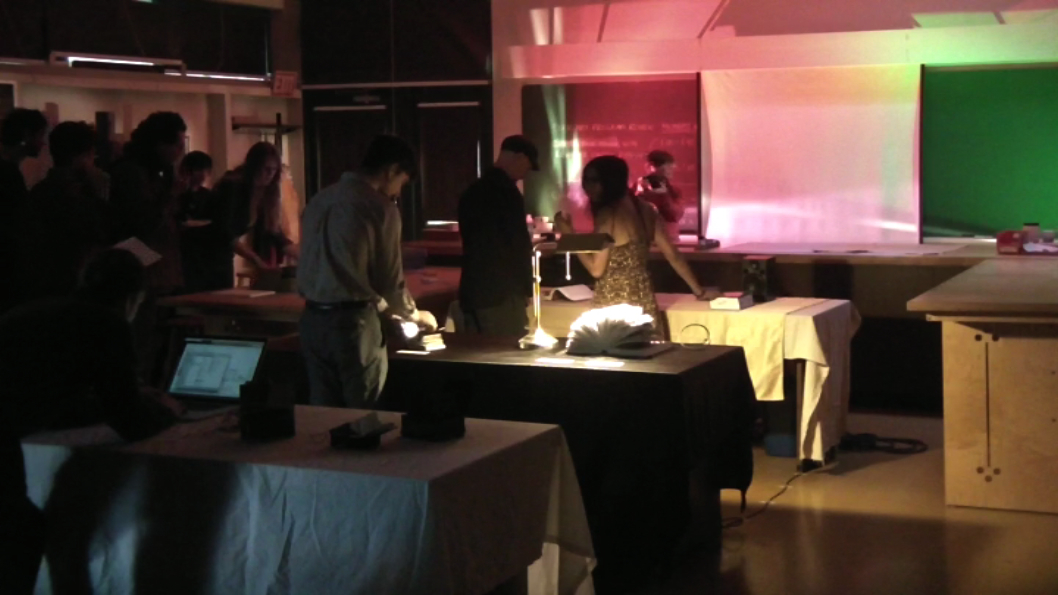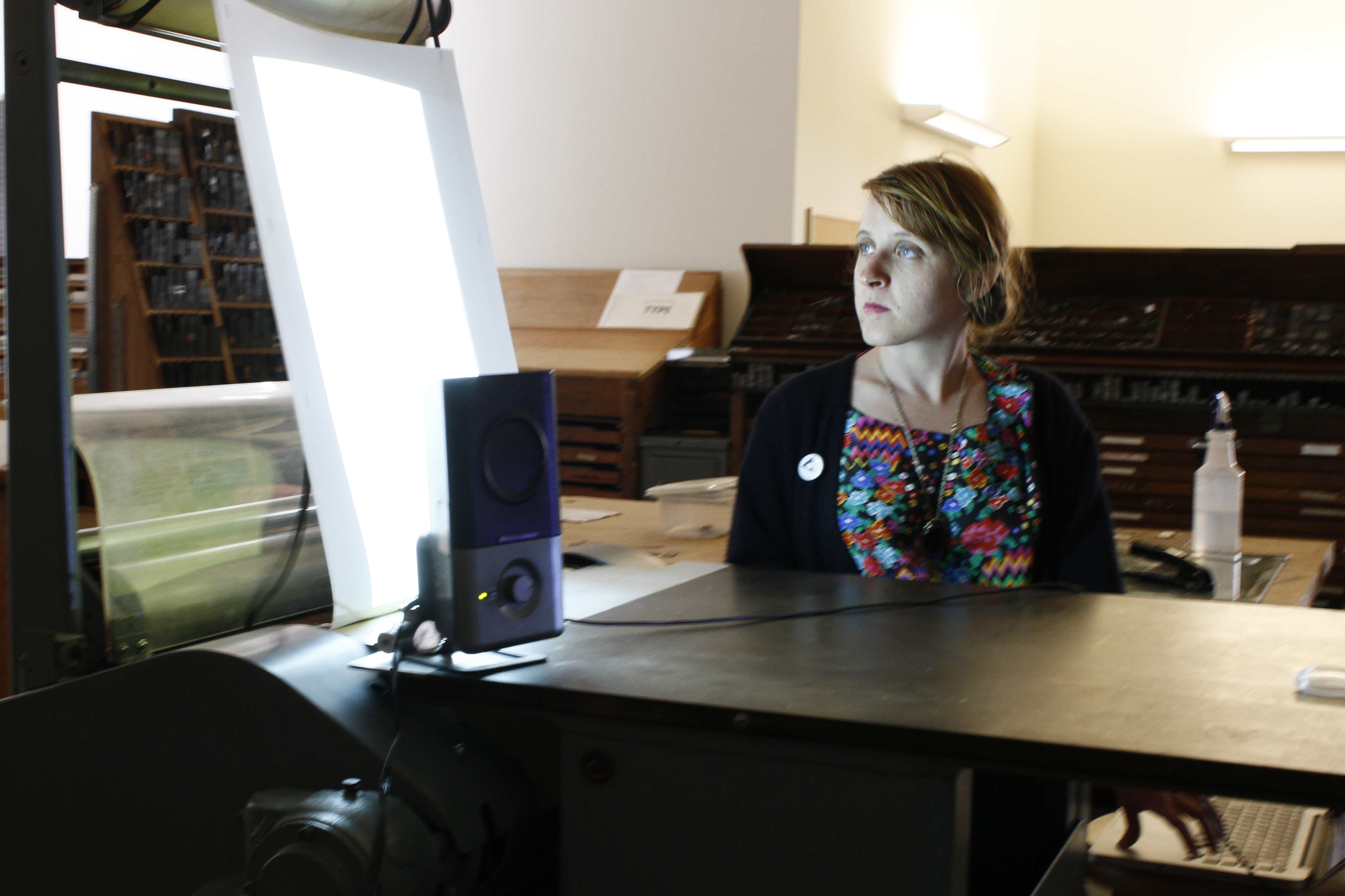 A sort of augmented translation of an existing artists’ book, Look Again combines collaboratively written text, letterpress and monoprinting, projection, audio recording, live performance, and even the automatic Vandercook press itself to comment upon the contextual and contingent manner in which information gets transmitted and perceived.
